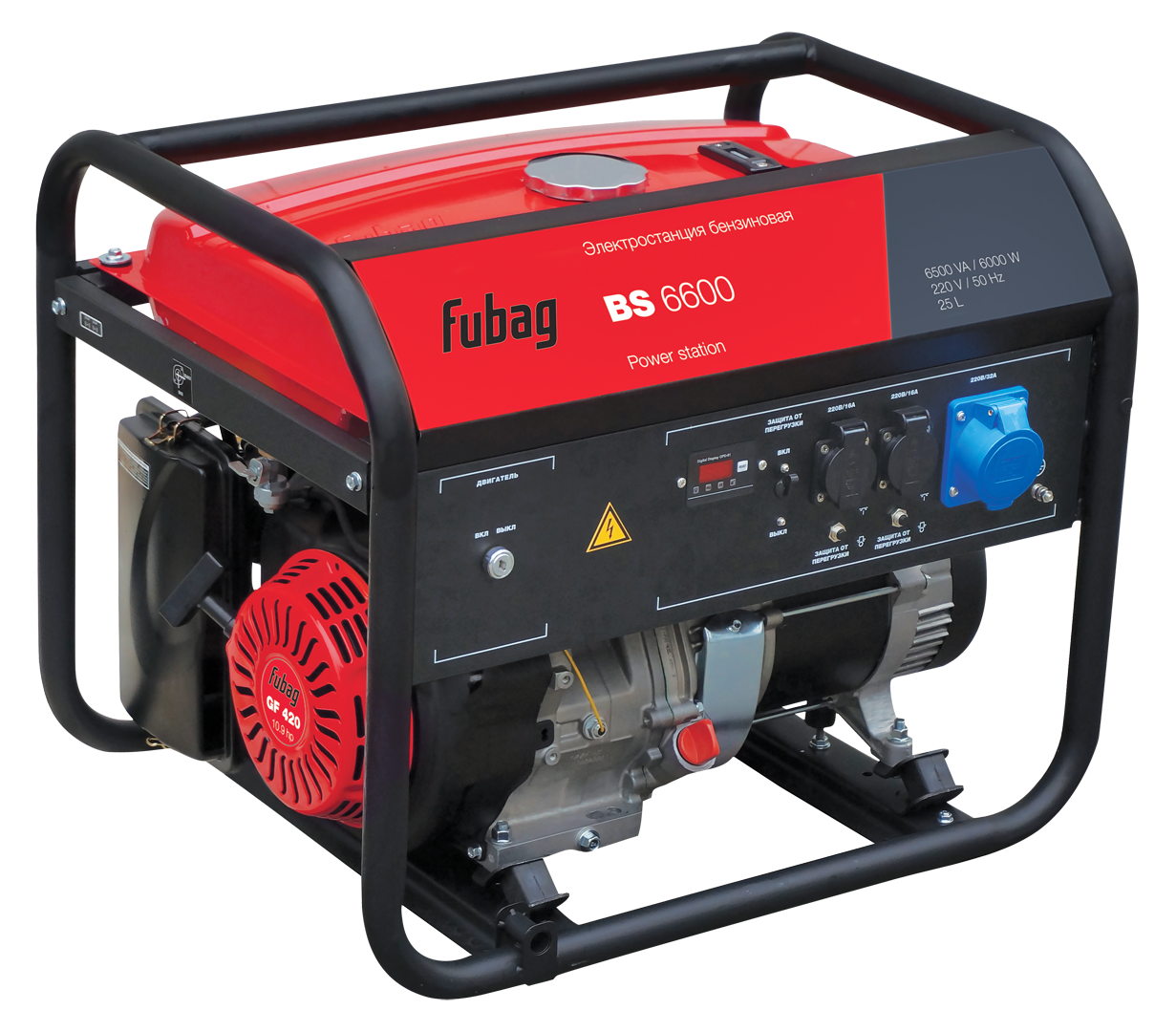 Оборудована мощным и экономичным профессиональным OHV-двигателем FUBAG. Номинальная электрическая мощность составляет 6 кВт, этого достаточно для работы бытовых электроприборов, включая насосы водоснабжения, электроинструмент и садовую технику. Оснащена тремя розетками 220В/16А х2, 220В/32А х1: две стандартные, рассчитанные на максимальный ток 16 А, и одной усиленной, 32 А, предназначенной для подключения особенно мощных потребителей.
