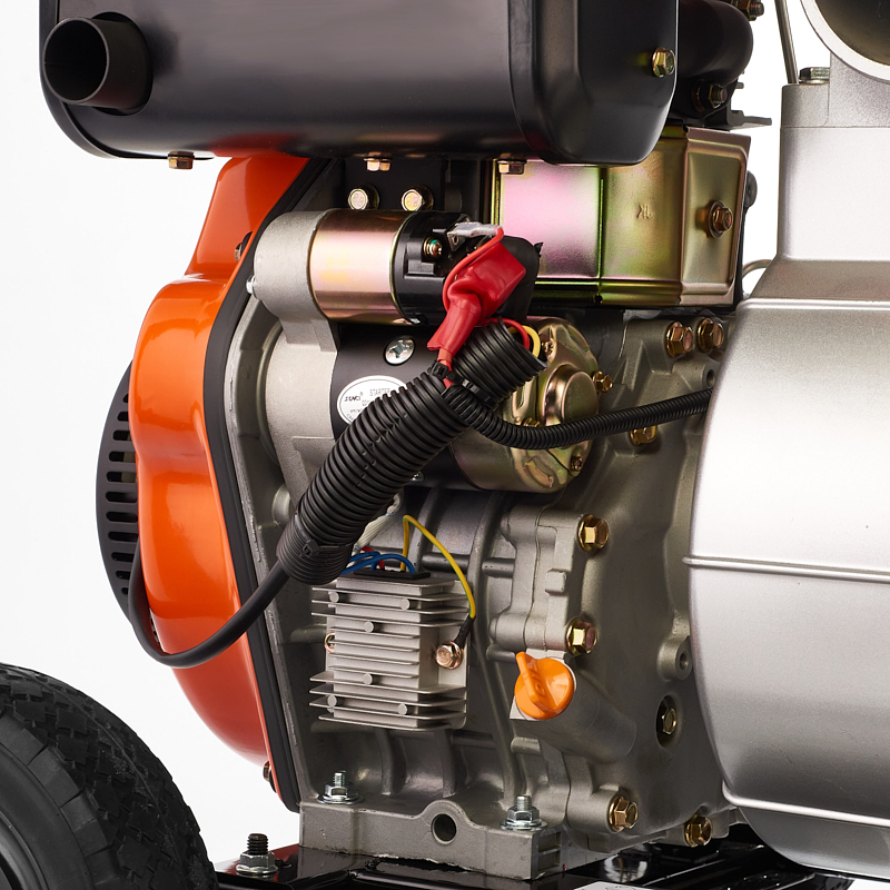 Дизельная мотопомпа, для сильно загрязненных вод (откачка строительных котлованов, осушение болот и ликвидация затоплений) лёгкосъёмная передняя крышка для очистки насосной части при засорении. Двигатель 188FE Макс. мощность 11,2 лс, Производительность 90 м³/час , напор 25 м, D вх/вых 100 мм, размер частиц 30 мм, бак 12,5 л