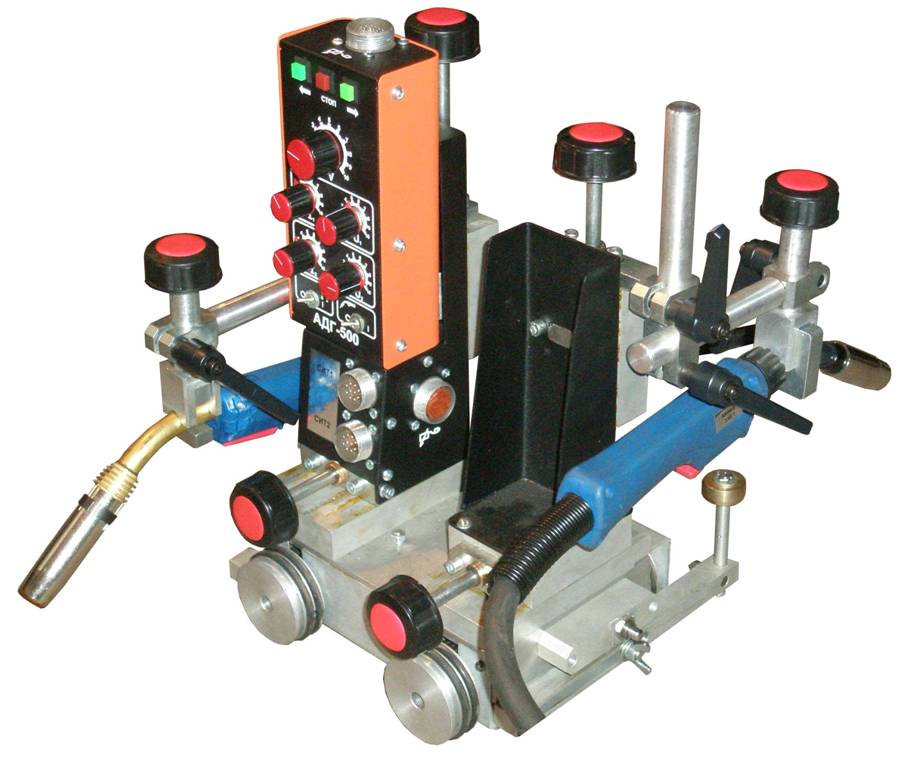 Компактный минитрактор АДГ-500 с электроприводом, предназначен для механизации процесса сварки плавящимся электродом в среде защитных газов (MIG/MAG) в горизонтальном, наклонном и вертикальном положениях. Для начала сварки необходимо только зафиксировать стандартную одну сварочную горелку или две сварочные горелки в нужном положении, а минитрактор выполнит сварку самостоятельно. Четыре ведущих колеса минитрактора обеспечивают равномерное и стабильное перемещение. Благодаря небольшой массе, минитрактор легко переставить с одного места сварки на другое. В зависимости от технических условий сварки минитрактор можно укомплектовать полуавтоматом с номинальным током от 300А до 600А., в состав которого входит источник и подающий механизм.