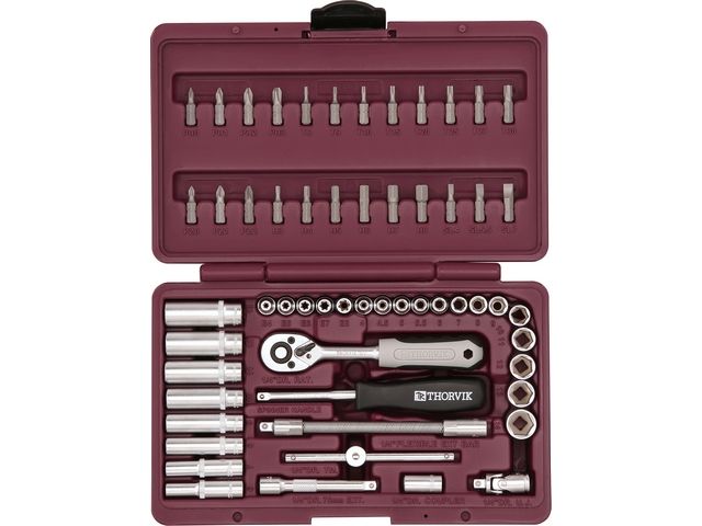 Набор инструментов 1/4"DR, 57 предметов, UTS0057, Thorvik, выполнен из высокопрочной хромованадиевой стали.